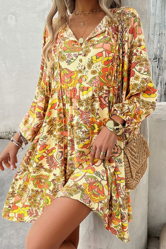 Women Floral Print V Neck Puff Sleeve Mini Dress
